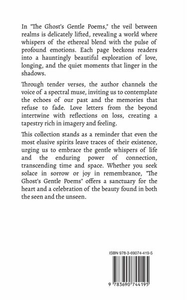 In "The Ghost's Gentle Poems," the veil between realms is delicately lifted, revealing a world where whispers of the ethereal blend with the pulse of profound emotions. Each page beckons readers into a hauntingly beautiful exploration of love, longing, and the quiet moments that linger in the shadows. Through tender verses, the author channels the voice of a spectral muse, inviting us to contemplate the echoes of our past and the memories that refuse to fade. Love letters from the beyond intertwine with reflections on loss, creating a tapestry rich in imagery and feeling. This collection stands as a reminder that even the most elusive spirits leave traces of their existence, urging us to embrace the gentle whispers of life and the enduring power of connection, transcending time and space. Whether you seek solace in sorrow or joy in remembrance, "The Ghost's Gentle Poems" offers a sanctuary for the heart and a celebration of the beauty found in both the seen and the unseen.