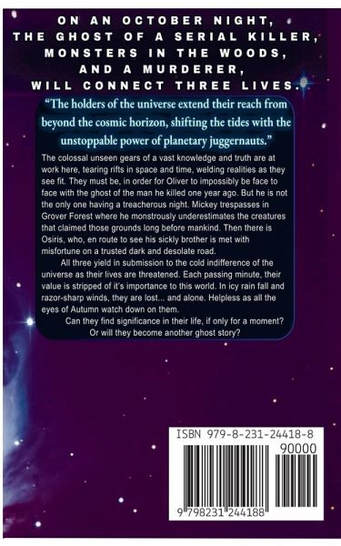 On an October night, the ghost of a serial killer, monsters in the woods, and a murderer will connect three lives. The colossal unseen gears of a vast knowledge and truth are at work here, tearing rifts in space and time, welding realities as they see fit. They must be, in order for Oliver to impossibly be face to face with the ghost of the man me killed one year ago. But he is not the only one having a treacherous night. Mickey trespasses in Grover Forest where he monstrously underestimates the creatures that claimed those grounds long before mankind. Then there is Osiris, who, en route to see his sickly brother is met with misfortune on a trusted dark and desolate road. All three yield in submission to the cold indifference of the universe as their lives are threatened. Each passing minute, their value is stripped of it's importance to this world. In icy rain fall and razor-sharp winds, they are lost... and alone. Helpless as all the eyes of Autumn watch down on them. Can they find significance in their life, if only for a moment? Or will they become another ghost story?
