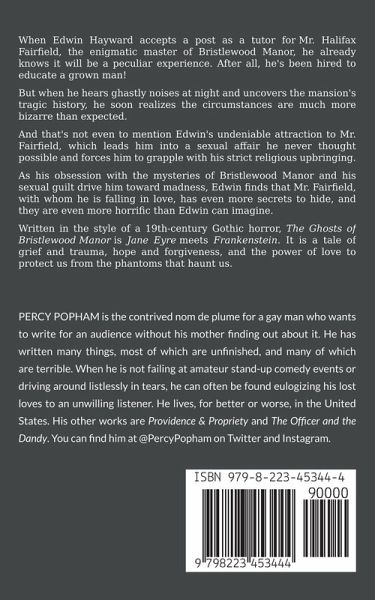 When Edwin Hayward accepts a post as a tutor for Mr. Halifax Fairfield, the enigmatic master of Bristlewood Manor, he already knows it will be a peculiar experience. After all, he's been hired to educate a grown man! But when he hears ghastly noises at night and uncovers the mansion's tragic history, he soon realizes the circumstances are much more bizarre than expected. And that's not even to mention Edwin's undeniable attraction to Mr. Fairfield, which leads him into a fiery sexual affair and forces him to grapple with his strict religious upbringing. As his obsession with the mysteries of Bristlewood Manor and his sexual guilt drive him toward madness, Edwin finds that Mr. Fairfield, with whom he is falling in love, has even more secrets to hide, and they are even more horrific than Edwin can imagine. Written in the style of a 19th-century Gothic horror, The Ghosts of Bristlewood Manor is Jane Eyre meets Frankenstein. It is a tale of grief and trauma, hope and forgiveness, and the power of love to protect us from the phantoms that haunt us.