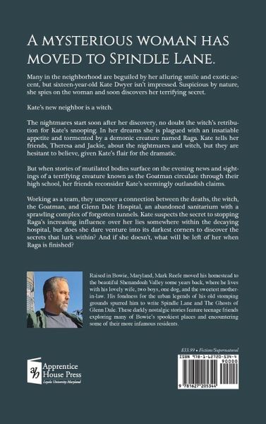 A mysterious woman has moved to Spindle Lane. Many in the neighborhood are beguiled by her alluring smile and exotic accent, but sixteen-year-old Kate Dwyer isn't impressed. Suspicious by nature, she spies on the woman and soon discovers her terrifying secret. Kate's new neighbor is a witch. The nightmares start soon after her discovery, no doubt the witch's retribution for Kate's snooping. In her dreams she is plagued with an insatiable appetite and tormented by a demonic creature named Raga. Kate tells her friends, Theresa and Jackie, about the nightmares and witch, but they are hesitant to believe, given Kate's flair for the dramatic. But when stories of mutilated bodies surface on the evening news and sightings of a terrifying creature known as the Goatman circulate through their high school, her friends reconsider Kate's seemingly outlandish claims. Working as a team, they uncover a connection between the deaths, the witch, the Goatman, and Glenn Dale Hospital, an abandoned sanitarium with a sprawling complex of forgotten tunnels. Kate suspects the secret to stopping Raga's increasing influence over her lies somewhere within the decaying hospital, but does she dare venture into its darkest corners to discover the secrets that lurk within? And if she doesn't, what will be left of her when Raga is finished?