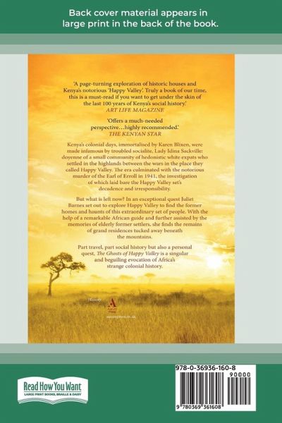 Happy Valley was the name given to the Wanjohi Valley in the Kenya Highlands, where a small community of affluent, hedonistic white expatriates settled between the wars. While Kenya's early colonial days have been immortalised by farming pioneers like Lord Delamere and Karen Blixen, and the pioneering aviator Beryl Markham, Happy Valley became infamous under the influence of troubled socialite, Lady Idina Sackville, whose life was told in Frances Osborne's bestselling The Bolter. The era culminated with the notorious murder of the Earl of Erroll in 1941, the investigation of which laid bare the Happy Valley set's decadence and irresponsibility, chronicled in another bestseller, James Fox's White Mischief. But what is left now? In a remarkable and indefatigable archaeological quest Juliet Barnes, who has lived in Kenya all her life and whose grandparents knew some of the Happy Valley characters, has set out to explore Happy Valley to find the former homes and haunts of this extraordinary and transient set of people. With the help of a remarkable African guide and further assisted by the memories of elderly former settlers, she finds the remains of grand residences tucked away beneath the mountains and speaks to local elders who share first - hand memories of these bygone times. Nowadays these old homes, she discovers, have become tumbledown dwellings for many African families, school buildings, or their ruins have almost disappeared without trace - a revelation of the state of modern Africa that makes the gilded era of the Happy Valley set even more fantastic. A book to set alongside such singular evocations of Africa's strange colonial history as The Africa House, The Ghosts of Happy Valley is a mesmerising blend of travel narrative, social history and personal quest.