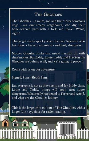The 'Ghoulies' - a mum, son and their three ferocious dogs - are our creepy neighbours, who dig their bone-covered yard with a fork and spoon. Weird, right? Things get really spooky when the two 'Normals' who live there - Farver, and Astrid - suddenly disappear. Mother Ghoulie thinks that Astrid has run off with their money. But Biddy, Louie, Teddy and I reckon the Ghoulies are behind it all, and we're going to prove it. Come with us on our adventure! Signed, Super Sleuth Sam. But everyone is not as they seem, and for Biddy, Sam, Louie and Teddy, things will soon turn super dangerous. What really happened to Farver and Astrid, and what are the Ghoulies hiding? This is the large print edition of The Ghoulies, with a larger font / typeface for easier reading.