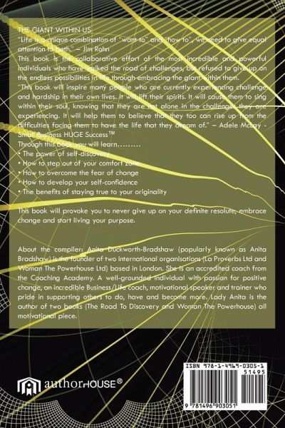 THE GIANT WITHIN US "Life is a unique combination of "want to" and "how to", we need to give equal attention to both." - Jim Rohn This book is the collaborative effort of the most incredible and powerful individuals who have walked the road of challenges, but refused to give up on the endless possibilities in life through embracing the giant within them. "This book will inspire many people who are currently experiencing challenge and hardship in their own lives. It will lift their spirits. It will cause them to sing within their soul, knowing that they are not alone in the challenges they are experiencing. It will help them to believe that they too can rise up from the difficulties facing them to have the life that they dream of." - Adele McLay - Small Business HUGE Success(TM) Through this book you will learn......... ¿ The power of self-discovery ¿ How to step out of your comfort zone ¿ How to overcome the fear of change ¿ How to develop your self-confidence ¿ The benefits of staying true to your originality This book will provoke you to never give up on your definite resolute, embrace change and start living your purpose.
