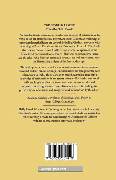 The Giddens Reader contains a comprehensive selection of readings from the works of the pre-eminent social theorist Anthony Giddens. A wide range of important theoretical issues are covered, including the author's encounter with the writings of Marx, Durkheim, Weber, Parsons and Foucault. The 'Reader' also presents elaborations of Giddens' own innovative approach to the fundamental questions of social theory. His views on power, time-space and the relationship between action and structure are well represented, as are his highly illuminating analyses of the 'late modern age'. The readings are prefaced by a straightforward introduction by the editor.