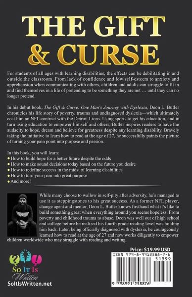 For students of all ages with learning disabilities, the effects can be debilitating in and outside the classroom. From lack of confidence and low self-esteem to anxiety and apprehension when communicating with others, children and adults can struggle to fit in and find themselves in a life of pretending to be something they are not ... until they can no longer pretend. In his debut book, The Gift & Curse: One Man's Journey with Dyslexia, Deon L. Butler chronicles his life story of poverty, trauma and undiagnosed dyslexia-which ultimately cost him an NFL contract with the Detroit Lions. Using sports to get his education, and in turn using education to empower himself and others, Butler inspires readers to have the audacity to hope, dream and believe for greatness despite any learning disability. Bravely taking the initiative to learn how to read at the age of 27, he successfully paints the picture of turning your pain point into purpose and passion.In this book, you will learn:How to build hope for a better future despite the odds How to make sound decisions today based on the future you desire How to redefine success in the midst of learning disabilities How to turn your pain into great purpose And more!