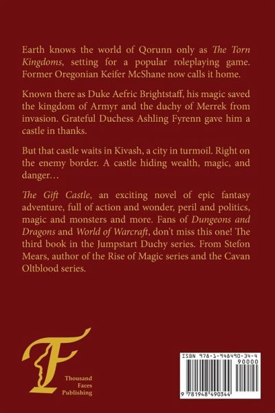 Earth knows the world of Qorunn only as The Torn Kingdoms, setting for a popular roleplaying game. Former Oregonian Keifer McShane now calls it home. Known there as Duke Aefric Brightstaff, his magic saved the kingdom of Armyr and the duchy of Merrek from invasion. Grateful Duchess Ashling Fyrenn gave him a castle in thanks. But that castle waits in Kivash, a city in turmoil. Right on the enemy border. A castle hiding wealth, magic, and danger... The Gift Castle, an exciting novel of epic fantasy adventure, full of action and wonder, peril and politics, magic and monsters and more. Fans of Dungeons and Dragons and World of Warcraft, don't miss this one! The third book in the Jumpstart Duchy series. From Stefon Mears, author of the Rise of Magic series and the Cavan Oltblood series.