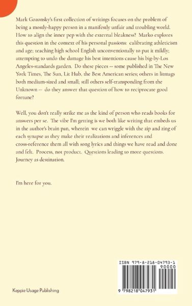 Mark Gozonsky's first collection of writings focuses on the problem of being a mostly-happy person in a manifestly unfair and troubling world. How to align the inner pep with the external bleakness? Marko explores this question in the context of his personal passions: calibrating athleticism and age; teaching high school English unconventionally to put it mildly; attempting to undo the damage his best intentions cause his big-by-Los Angeles-standards garden. Do these pieces -- some published in The New York Times, The Sun, Lit Hub, the Best American series; others in litmags both medium-sized and small; still others self-transponding from the Unknown -- do they answer that question of how to reciprocate good fortune? Well, you don't really strike me as the kind of person who reads books for answers per se. The vibe I'm getting is we both like writing that embeds us in the author's brain pan, wherein we can wriggle with the zip and zing of each synapse as they make their realizations and inferences and cross-reference them all with song lyrics and things we have read and done and felt. Process, not product. Questions leading to more questions. Journey as destination. I'm here for you.
