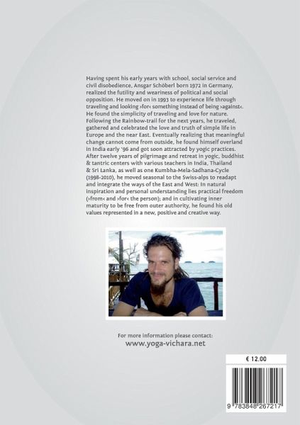 Having spent his early years with school, social service and civil disobedience, Ansgar Schöberl born 1972 in Germany, realized the futility and weariness of political and social opposition. He moved on in 1993 to experience life through traveling and looking ¿for¿ something instead of being ¿against¿. He found the simplicity of traveling and love for nature. Following the Rainbow-trail for the next years, he traveled, gathered and celebrated the love and truth of simple life in Europe and the near East. Eventually realizing that meaningful change cannot come from outside, he found himself overland in India early '96 and got soon attracted by yogic practices. After twelve years of pilgrimage and retreat in yogic, buddhist & tantric centers with various teachers in India, Thailand & Sri Lanka, as well as one Kumbha-Mela-Sadhana-Cycle (1998-2010), he moved seasonal to the Swiss-alps to readapt and integrate the ways of the East and West: In natural inspiration and personal understanding lies practical freedom (¿from¿ and ¿for¿ the person); and in cultivating inner maturity to be free from outer authority, he found his old values represented in a new, positive and creative way.