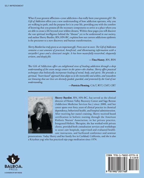 What if your greatest affliction-your addiction-has really been your greatest gift? The Gift of Addiction offers you a new understanding of how addiction operates, why you are walking its path, and the purpose for it in your life, providing you with the comfort of knowing that you possess all the necessary components to arrive at a place where you are able to create a life beyond your wildest dreams. Within these pages you will discover the vast spiritual intelligence behind the "disease" yet to be understood in our society, and author Sherry Burditt, RN, HN-BC, explains how our current addictions epidemic is the precursor to a new discovery and human transformation. Sherry Burditt has truly given us an important gift. From cover to cover, The Gift of Addiction contains a vast amount of practical, beneficial, and illuminating information with a storyteller's grace and a clinician's insight. It has been masterfully researched, eloquently written, and deeply felt. -Tina Haney, RN, BSN The Gift of Addiction offers an enlightened view of healing addiction through a deep understanding of the seven energy centers in the spine-the chakras. Sherry offers practical techniques that holistically incorporate healing of mind, body, and spirit. She provides a spiritual, "heart-based" approach that aligns us to the invincible soul within, and reawakens our knowing that our lives are divinely guided, guarded, and protected by the God of our understanding. -Patricia Fleming, CAcT, RYT, CMT, CRT