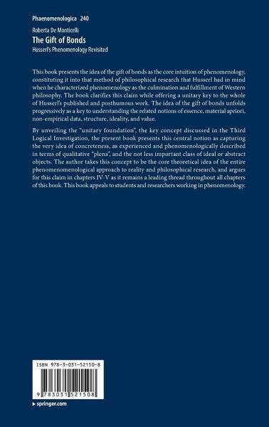 This book presents the idea of the gift of bonds as the core intuition of phenomenology, constituting it into that method of philosophical research that Husserl had in mind when he characterized phenomenology as the culmination and fulfillment of Western philosophy. The book clarifies this claim while offering a unitary key to the whole of Husserl's published and posthumous work. The idea of the gift of bonds unfolds progressively as a key to understanding the related notions of essence, material apriori, non-empirical data, structure, ideality, and value.