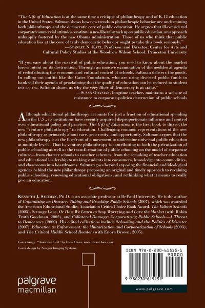 "The Gift of Education is at the same time a critique of philanthropy and of K-12 education in the United States. Saltman shows how new trends in philanthropic behavior are undermining both philanthropy and the democratic core of public education.He argues thatill-considered corporate/commercial attitudes constitute a neo-liberal attack upon public education, an approach unhappily fostered by the new Obama administration.Those of us who think that public education lies at the core of truly democratic behavior ought to take this book seriously." - Stanley N. Katz, Professor and Director, Center for Arts and Cultural Policy Studies at the Woodrow Wilson School, Princeton University