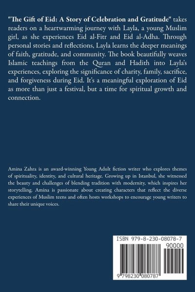 "The Gift of Eid: A Story of Celebration and Gratitude" takes readers on a heartwarming journey with Layla, a young Muslim girl, as she experiences Eid al-Fitr and Eid al-Adha. Through personal stories and reflections, Layla learns the deeper meanings of faith, gratitude, and community. The book beautifully weaves Islamic teachings from the Quran and Hadith into Layla's experiences, exploring the significance of charity, family, sacrifice, and forgiveness during Eid. It's a meaningful exploration of Eid as more than just a festival, but a time for spiritual growth and connection.