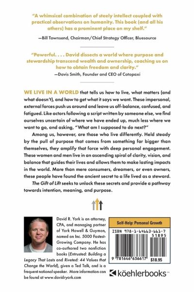 We live in a world that tells us how to live, what matters (and what doesn't), and how to get what it says we want. These impersonal, external forces push us around and leave us off-balance, confused, and fatigued. Like actors following a script written by someone else, we find ourselves uncertain of where we have ended up, much less where we want to go, and asking, "What am I supposed to do next?" Among us, however, are those who live differently. Held steady by the pull of purpose that comes from something far bigger than themselves, they amplify that force with deep personal engagement. These women and men live in an ascending spiral of clarity, vision, and balance that guides their lives and allows them to make lasting impacts in the world. More than mere consumers, dreamers, or even owners, these people have found the ancient secret to a life lived as a steward. The Gift of Lift seeks to unlock these secrets and provide a pathway towards intention, meaning, and purpose.