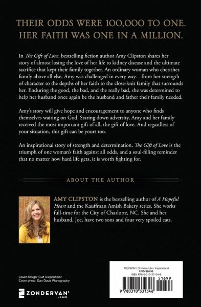 Their odds were 100,000 to one. Her faith was 1 in a million. In The Gift of Love, bestselling fiction author Amy Clipston shares her story of almost losing the love of her life to kidney disease and the ultimate sacrifice that kept their family together. An ordinary woman who cherishes family above all else, Amy was challenged in every way--from her strength of character to the depths of her faith to the close-knit family that surrounds her. Enduring the good, the bad, and the really bad, she was determined to help her husband once again be the husband and father their family needed. Amy's story will give hope and encouragement to anyone who finds themselves waiting on God. Staring down adversity, Amy and her family received the most important gift of all, the gift of love. And regardless of your situation, this gift can be yours too. An inspirational story of strength and determination, The Gift of Love is the triumph of one woman's faith against all odds, and a soul-filling reminder that no matter how hard life gets, it is worth fighting for.