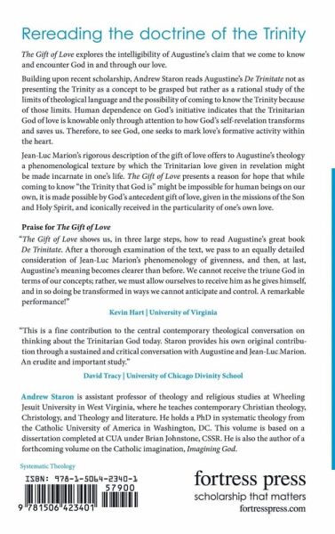 The Gift of Love builds upon recent scholarship and reads Augustines De Trinitate as a rational study of the limits of theological language and the possibility of knowing the Trinity because of those limits. Marions description of the gift of love offers to Augustines theology a phenomenological texture by which the trinitarian love given might be made incarnate in ones life. The Gift of Love presents a reason for hope that the signification of the Trinity that God is, while impossible for human beings is not impossible for God.