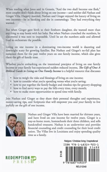 When reading what Jesus said in Genesis, "And the two shall become one flesh," most couples don’t think about living on one income—and neither did Nathan and Ginger Villa. Happily married, Nathan and Ginger enjoyed the luxury of living on two incomes—he in banking and she in cosmetology. They had everything they wanted. But when Ginger gave birth to their firstborn daughter, she wanted more than anything to stay home with her baby. But when Nathan crunched the numbers, he discovered it was next to impossible. Until he set the numbers aside and allowed God to orchestrate the possible. Living on one income in a dominating two-income world is daunting and downright scary for growing families. But Nathan and Ginger’s no-fail plan has sustained them for the past twelve years on one family income, which also gives them the gift of family time. Whether you’re embarking on the intentional precipice of living on one family income or your family has experienced sudden reduced income, The Gift of One: A Biblical Guide to Living on One Family Income is a helpful resource that discusses how to weigh the risks and blessings of living on one income; how to consider what you’re spending versus what you’re saving; how to put together the family budget and timeless tips for grocery shopping; how to find savvy ways to pay the bills every time, every month; how to make more opportunities to spend time with family. Join Nathan and Ginger as they share their personal thoughts and experiences, money-saving tips, and Scriptures that will empower you and your family to live joyfully on the gift of one income.