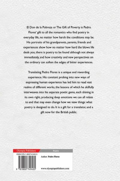 El Don de la Pobreza or The Gift of Poverty is Pedro Flores' gift to all the romantics who find poetry in everyday life, no matter how harsh the conditions may be. His portraits of his grandparents, parents, friends and experiences show how no matter how hard the blows life deals you, there is poetry to be found although not always immediately, and how creativity and new perspectives on the ordinary can soften the edges of bitter experiences. Translating Pedro Flores is a unique and rewarding experience. His constant probing into new ways of expressing human experience has led him to read vast realms of different works, the lessons of which he skilfully interweaves into his separate poetic gems, each shining in its own right, producing deep emotions we can all relate to and that may even change how we view things: what poetry is designed to do. It is a gift for a translator, and a gift now for the British public. Margaret Hart Robertson