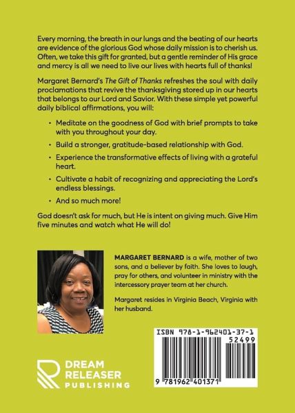 Every morning, the breath in our lungs and the beating of our hearts are evidence of the glorious God whose daily mission is to cherish us. Often, we take this gift for granted, but a gentle reminder of His grace and mercy is all we need to live our lives with hearts full of thanks!Margaret Bernard's The Gift of Thanks refreshes the soul with daily proclamations that revive the thanksgiving stored up in our hearts that belongs to our Lord and Savior. With these simple yet powerful daily biblical affirmations, you will:Meditate on the goodness of God with brief prompts to take with you throughout your day. Build a stronger, gratitude-based relationship with God. Experience the transformative effects of living with a grateful heart. Cultivate a habit of recognizing and appreciating the Lord's endless blessings. And so much more! God doesn't ask for much, but He is intent on giving much. Give Him five minutes and watch what He will do!
