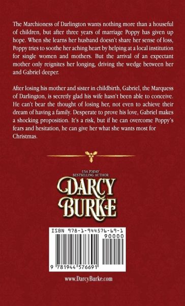 The Marchioness of Darlington wants nothing more than a houseful of children, but after three years of marriage Poppy has given up hope. When she learns her husband doesn't share her sense of loss, Poppy tries to soothe her aching heart by helping at a local institution for single women and mothers. But the arrival of an expectant mother only reignites her longing, driving the wedge between her and Gabriel deeper. After losing his mother and sister in childbirth, Gabriel, the Marquess of Darlington, is secretly glad his wife hasn't been able to conceive. He can't bear the thought of losing her, not even to achieve their dream of having a family. Desperate to prove his love, Gabriel makes a shocking proposition. It's a risk, but if he can overcome Poppy's fears and hesitation, he can give her what she wants most for Christmas.
