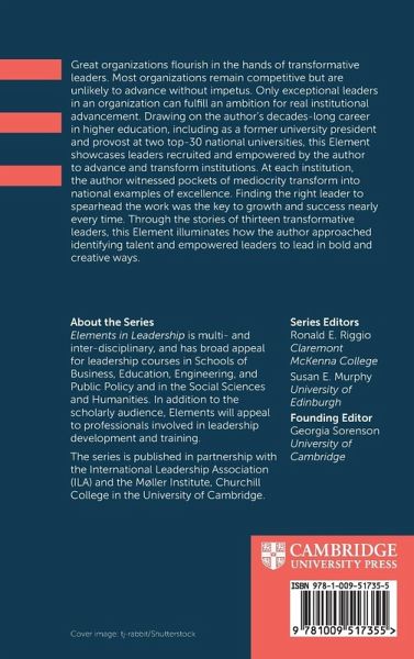 Great organizations flourish at the hands of transformative leaders. Most organizations remain competitive but are unlikely to advance without impetus. Only exceptional leaders in an organization can fulfill an ambition for real institutional advancement. In this Element, Nathan Hatch, a former university president and provost at two top-30 national universities, draws on their more than forty-year career in higher education to showcase leaders the author recruited and empowered to advance and transform institutions. At each institution, the author witnessed pockets of mediocrity transform into national examples of excellence. Finding the right leader to spearhead the work was the key to growth and success nearly every time. Through the stories of thirteen transformative leaders, Hatch illuminates how the author approached identifying talent and empowered leaders to lead in bold and creative ways.