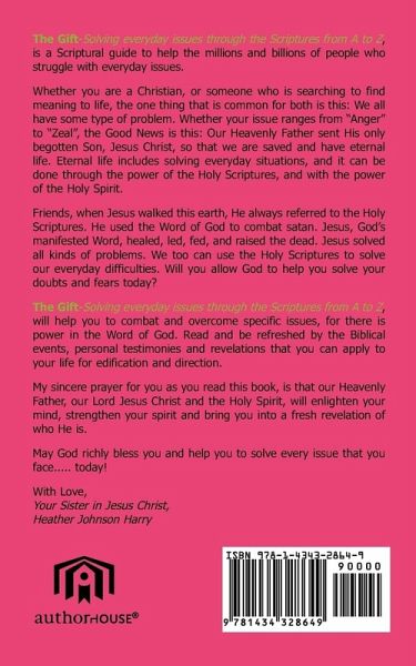 The Gift-Solving everyday issues through the Scriptures from A to Z, is a Scriptural guide to help the millions and billions of people who struggle with everyday issues. Whether you are a Christian, or someone who is searching to find meaning to life, the one thing that is common for both is this: We all have some type of problem. Whether your issue ranges from "Anger" to "Zeal", the Good News is this: Our Heavenly Father sent His only begotten Son, Jesus Christ, so that we are saved and have eternal life. Eternal life includes solving everyday situations, and it can be done through the power of the Holy Scriptures, and with the power of the Holy Spirit. Friends, when Jesus walked this earth, He always referred to the Holy Scriptures. He used the Word of God to combat satan. Jesus, God's manifested Word, healed, led, fed, and raised the dead. Jesus solved all kinds of problems. We too can use the Holy Scriptures to solve our everyday difficulties. Will you allow God to help you solve your doubts and fears today? The Gift-Solving everyday issues through the Scriptures from A-Z, will help you to combat and overcome specific issues, for there is power in the Word of God. Read and be refreshed by the Biblical events, personal testimonies and revelations that you can apply to your life for edification and direction. My sincere prayer for you as you read this book, is that our Heavenly Father, our Lord Jesus Christ and the Holy Spirit, will enlighten your mind, strengthen your spirit and bring you into a fresh revelation of who He is. May God richly bless you and help you to solve every issue that you face..... today! With Love, Your Sister in Jesus Christ, Heather Johnson Harry