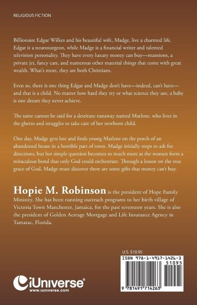 Billionaire Edgar Wilkes and his beautiful wife, Madge, live a charmed life. Edgar is a neurosurgeon, while Madge is a financial writer and talented television personality. They have every luxury money can buy mansions, a private jet, fancy cars, and numerous other material things that come with great wealth. What's more, they are both Christians. Even so, there is one thing Edgar and Madge don't have-indeed, can't have-and that is a child. No matter how hard they try or what science they use, a baby is one dream they never achieve. The same cannot be said for a destitute runaway named Marlene, who lives in the ghetto and struggles to take care of her newborn child. One day, Madge gets lost and finds young Marlene on the porch of an abandoned house in a horrible part of town. Madge initially stops to ask for directions, but her simple question becomes so much more as the women form a miraculous bond that only God could orchestrate. Through a lesson on the true grace of God, Madge must discover there are some gifts that money can't buy.