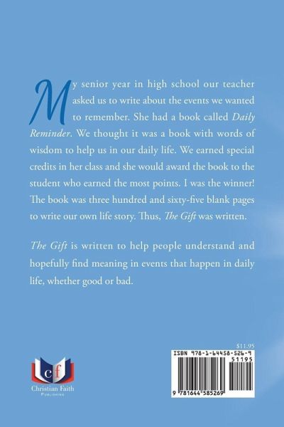 My senior year in high school our teacher asked us to write about the events we wanted to remember. She had a book called Daily Reminder. We thought it was a book with words of wisdom to help us in our daily life. We earned special credits in her class and she would award the book to the student who earned the most points. I was the winner! The book was three hundred and sixty-five blank pages to write our own life story. Thus, The Gift was written. The Gift is written to help people understand and hopefully find meaning in events that happen in daily life, whether good or bad.