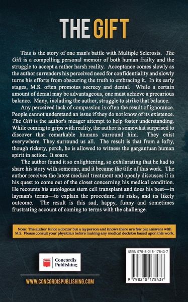 This is the story of one man's battle with Multiple Sclerosis. The Gift is a compelling personal memoir of both human frailty and the struggle to accept a rather harsh reality. Acceptance comes slowly as the author surrenders his perceived need for confidentiality and slowly turns his efforts from obscuring the truth to embracing it. In its early stages, M.S. often promotes secrecy and denial. While a certain amount of denial may be advantageous, one must achieve a precarious balance. Many, including the author, struggle to strike that balance. Any perceived lack of compassion is often the result of ignorance. People cannot understand an issue if they do not know of its existence. The Gift is the author's meager attempt to help foster understanding. While coming to grips with reality, the author is somewhat surprised to discover that remarkable humans surround him. They exist everywhere. They surround us all. The result is that from a lofty, though rickety, perch, he is allowed to witness the gargantuan human spirit in action. It soars.