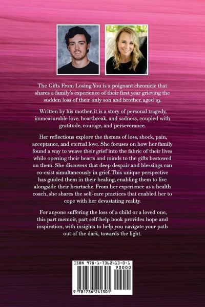 For anyone suffering the loss of a child or a loved one, this part memoir, part self-help book provides hope and inspiration, with insights to help you navigate your path out of the dark, towards the light. The Gifts From Losing You is a poignant chronicle that shares a family's experience of their first year grieving the sudden loss of their only son and brother, aged 19. Written by his mother, it is a story of personal tragedy, immeasurable love, heartbreak, and sadness, coupled with gratitude, courage, and perseverance. Her reflections explore the themes of loss, shock, pain, acceptance, and eternal love. She focuses on how her family found a way to weave their grief into the fabric of their lives while opening their hearts and minds to the gifts bestowed on them. She discovers that deep despair and blessings can co-exist simultaneously in grief. This unique perspective has guided them in their healing, enabling them to live alongside their heartache. From her experience as a health coach, she shares the self-care practices that enabled her to cope with her devastating reality.