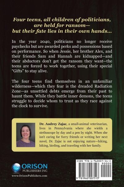 Four teens, all children of politicians, are held for ransom-but their fate lies in their own hands... In the year 2040, politicians no longer receive paychecks but are awarded perks and possessions based on performance. So when Jessie, her brother Alex, and their friends Sam and Hannah are kidnapped-and their abductors don't get the ransom they want-the teens are forced to work together, using their special "Gifts" to stay alive. The four teens find themselves in an unfamiliar wilderness-which they fear is the dreaded Radiation Zone-as unsettled debts emerge from their past to haunt them. While they battle inner demons, the teens struggle to decide whom to trust as they race against the clock to survive.