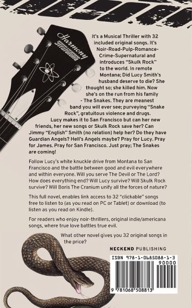 It's a rock and roll thriller. It's noir-road-pulp-romance-crime-supernatural trip. None of the above is an easy ride for Lucy Smith. Did her husband deserve to die? She thought so; she killed him. Now she's on the run from his family - The Snakes. They are meanest band you will ever see; purveyors of gratuitous violence, drugs, and Snake Rock. Jimmy "English" Smith (no relation) has been on a similar journey from Manchester England, to San Francisco Lucy makes it to San Francisco, but can her new friends, her new songs or Skulk Rock save her? Can Jimmy "English" Smith help her? Do they have Guardian Angels? Hell's Angels maybe? Pray for Lucy. Pray for James. Pray for San Francisco. Just pray; The Snakes are coming! Follow Lucy's white knuckle drive from Montana to San Francisco and the battle between good and evil everywhere and within everyone. Will you serve The Devil or The Lord? How does everything end? Will Lucy survive? Will Skulk Rock survive? This full novel, enables link access to all the included songs free to listen to (as you read on PC or Tablet) or download (to listen as you read on Kindle). For readers who enjoy noir-thrillers, original Indie/Americana songs, where true love battles true evil. What other novel gives you 32 original songs in the price?