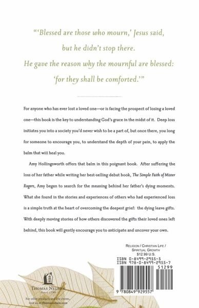 Not all gifts are tangible. After suffering the loss of her father while writing her bestselling debut book, Amy Hollingsworth began to search for the meaning behind his dying moments. What she found was a simple truth at the heart of overcoming the deepest grief: the dying leave gifts. With deeply moving stories of how others discovered the gifts their loved ones left behind, this book will gently encourage you to anticipate and uncover your own. Weaving together the warm intimacy of Mitch Albom's Tuesdays with Morrie and the straightforward honesty of Joan Didion's The Year of Magical Thinking, Amy Hollingsworth adds her hopeful voice to the literature of life and the life beyond. The result is a collection of stories that gives the reader myriad ways to identify their own pain and healing and is an intriguing journey for any and all readers fascinated by this brief overlap of heaven and earth. From the bestselling author of The Simple Faith of Mister Rogers.