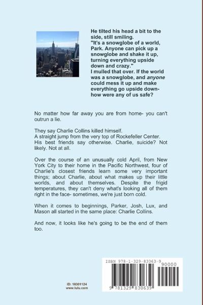 No matter how far away you are from home- you can't outrun a lie. They say Charlie Collins killed himself. A straight jump from the very top of Rockefeller Center. His best friends say otherwise. Charlie, suicide? Not likely. Not at all. Over the course of an unusually cold April, from New York City to their home in the Pacific Northwest, four of Charlie's closest friends learn some very important things; about Charlie, about what makes up their little worlds, and about themselves. Despite the frigid temperatures, they can't deny what's looking all of them right in the face- sometimes, we're just born cold. When it comes to beginnings, Parker, Josh, Lux, and Mason all started in the same place: Charlie Collins. And now, it looks like he's going to be the end of them too.