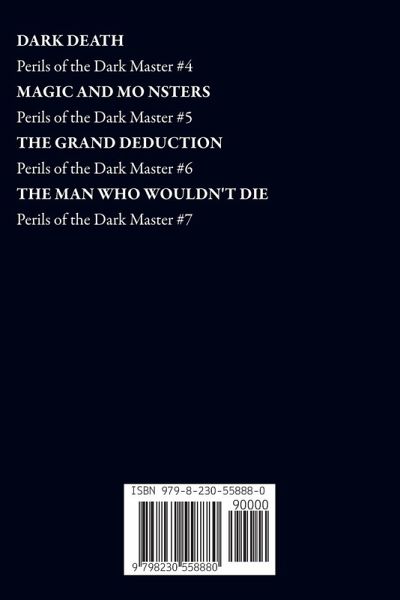 THE CONCLUDING FOUR BOOKS IN THE SHERLOCK HOLMES PERILS OF THE DARK MASTER SERIES! DARK DEATH MAGIC AND MONSTERS THE GRAND DEDUCTION THE MAN WHO WOULDN'T DIE THE FANTASTIC PERILS OF THE DARK MASTER SERIES COMES TO A SMASHING CONCLUSION! WHO IS THE DARK MASTER AND WHY HAS HE DRAWN THEM TO A MYSTERIOUS ISLAND TO CHALLENGE THEIR COURAGE AND STRENGTH? WHO WILL LIVE AND WHO WILL DIE AS THE CHALLENGES MOUNT FOR HOLMES AND HIS BRAVE FRIENDS?