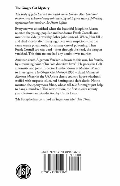 The body of John Cornell the well-known London Merchant and banker, was exhumed early this morning with great secrecy, following representations made to the Home Office. Everyone was astonished when the beautiful Josephine Rivron rejected the young, popular and handsome Frank Cornell, and married his elderly, wealthy father John instead. When John fell ill and died shortly after marrying, there were suspicions that the cause wasn’t pneumonia, but a nasty case of poisoning. Then Frank Cornell too was dead – shot through the head, the weapon vanished. This time no one had any doubt it was murder. Amateur sleuth Algernon Vereker is drawn to this case, his fourth, by a recurring bout of his "old detective fever". He packs his Colt automatic and joins Inspector Heather down at Marston Manor to investigate. The Ginger Cat Mystery (1935 – titled Murder at Marston Manor in the USA) is a classic country house whodunit stuffed with suspects, clues, red herrings and dark deeds. Not to mention the eponymous feline, whose tell-tale fur might just help to hang a murderer. This new edition, the first in over seventy years, features an introduction by Curtis Evans. ‘Mr Forsythe has contrived an ingenious tale.’ The Times