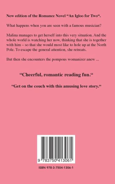 New edition of the Romance Novel "An Igloo for Two".What happens when you are seen with a famous musician?Malina manages to get herself into this very situation. And the whole world is watching her now, thinking that she is together with him - so that she would most like to hole up at the North Pole. To escape the general attention, she retreats.But then she encounters the pompous womanizer anew ..."Cheerful, romantic reading fun.""Get on the couch with this amusing love story."