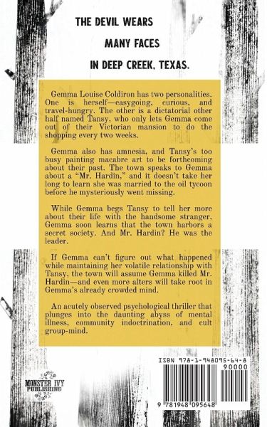 Gemma Louise Coldiron has two personalities. One is herself-easygoing, curious, and travel-hungry. The other is a dictatorial other half named Tansy, who only lets Gemma come out of their Victorian mansion to do the shopping every two weeks. Gemma also has amnesia, and Tansy's too busy painting macabre art to be forthcoming about their past. The town speaks to Gemma about a "Mr. Hardin," and it doesn't take her long to learn she was married to the oil tycoon before he mysteriously went missing. While Gemma begs Tansy to tell her more about their life with the handsome stranger, Gemma soon learns that the town harbors a secret society. And Mr. Hardin? He was the leader. If Gemma can't figure out what happened while maintaining her volatile relationship with Tansy, the town will assume Gemma killed Mr. Hardin-and even more alters will take root in Gemma's already crowded mind. An acutely observed modern-day psychological thriller that plunges into the daunting abyss of mental illness, community indoctrination, and cult group-mind.