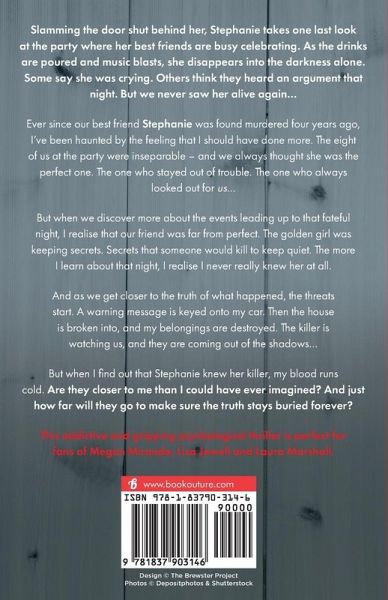 Slamming the door shut behind her, Stephanie takes one last look at the party where her best friends are busy celebrating. As the drinks are poured and music blasts, she disappears into the darkness alone. Some say she was crying. Others think they heard an argument that night. But we never saw her alive again... Ever since our best friend Stephanie was found murdered four years ago, I've been haunted by the feeling that I should have done more. The eight of us at the party were inseparable - and we always thought she was the perfect one. The one who stayed out of trouble. The one who always looked out for us... But when we discover more about the events leading up to that fateful night, I realise that our friend was far from perfect. The golden girl was keeping secrets. Secrets that someone would kill to keep quiet. The more I learn about that night, I realise I never really knew her at all. And as we get closer to the truth of what happened, the threats start. A warning message is keyed onto my car. Then the house is broken into, and my belongings are destroyed. The killer is watching us, and they are coming out of the shadows... But when I find out that Stephanie knew her killer, my blood runs cold. Are they closer to me than I could have ever imagined? And just how far will they go to make sure the truth stays buried forever? This addictive and gripping psychological thriller is perfect for fans of Megan Miranda, Lisa Jewell and Laura Marshall. What readers are saying about The Girl at the Party: "Wow!! I finished this book in one sitting! I could not put it down! Addictive and thrilling are two words that perfectly describe this! I love this! Rocked my socks! Perfect read for a rainy weekend!!!" Goodreads reviewer ¿¿¿¿¿¿¿¿¿¿ "Full of secrets! I LOVED THIS BOOK!... The ending was a total shocker that left me picking my jaw up off the floor. This one kept me engaged from the very first page." Goodreads reviewer ¿¿¿¿¿¿¿¿¿¿ "This book had my stomach in knots! From the first page until the last I was completely immersed... A gripping and at times heart-wrenching read... Left me shocked!" Goodreads reviewer ¿¿¿¿¿¿¿¿¿¿ "Heart-pounding thriller that left me on the edge of my seat. I thoroughly enjoyed reading this one. Definitely one of the best books this year." Netgalley reviewer ¿¿¿¿¿¿¿¿¿¿ "Suspenseful, gripping, and fast-paced. I couldn't read this book quick enough to find out what happened." Goodreads reviewer ¿¿¿¿¿¿¿¿¿¿