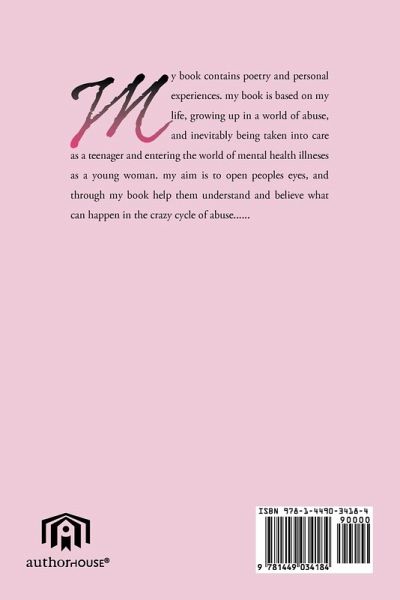 my book contains poetry and personal experiences. my book is based on my life, growing up in a world of abuse, and inevitably being taken into care as a teenager and entering the world of mental health illneses as a young woman. my aim is open peoples eyes, and through my book help them understand and believe what can happen in the crazy cycle of abuse......