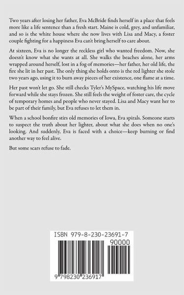 Two years after losing her father, Eva McBride finds herself in a place that feels more like a life sentence than a fresh start. Maine is cold, grey, and unfamiliar, and so is the white house where she now lives with Lisa and Macy, a foster couple fighting for a happiness Eva can't bring herself to care about. At sixteen, Eva is no longer the reckless girl who wanted freedom. Now, she doesn't know what she wants at all. She walks the beaches alone, her arms wrapped around herself, lost in a fog of memories-her father, her old life, the fire she lit in her past. The only thing she holds onto is the red lighter she stole two years ago, using it to burn away pieces of her existence, one flame at a time. Her past won't let go. She still checks Tyler's MySpace, watching his life move forward while she stays frozen. She still feels the weight of foster care, the cycle of temporary homes and people who never stayed. Lisa and Macy want her to be part of their family, but Eva refuses to let them in. When a school bonfire stirs old memories of Iowa, Eva spirals. Someone starts to suspect the truth about her lighter, about what she does when no one's looking. And suddenly, Eva is faced with a choice-keep burning or find another way to feel alive. But some scars refuse to fade.