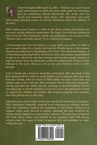 Grace Livingston Hill (April 16, 1865 – February 23, 1947) was an early 20th-century novelist and wrote both under her real name and the pseudonym Marcia Macdonald. She wrote over 100 novels and numerous short stories. Her characters were most often young Christian women or become Christians within the confines of the story. Hill's writing career began as a child in the 1870s, writing short stories for her aunt's weekly children's publication, The Pansy. Her first story printed in book form was The Esselstynes, which was published in 1877 as part of the "Mother's Boys and Girls Library" by D. Lothrop & Company. A Chautauqua Idyl, her first book as a young adult, was written in 1887 to earn enough money for a family trip from her Florida home to the summer Chautauqua gathering at Chautauqua, New York. This illustrated allegory of a Chautauqua gathering held by the flowers, tree, and animals was published in time to be offered for sale that summer and brought enough earnings to take the family there. Several books written in collaboration with her family followed in the early 1890s, as well as her only children's book, A Little Servant. Lack of funds was a frequent motivator, particularly after the death of her first husband left her with two small children and no income other than that from her writing. After the death of Hill's father less than a year later, her mother came to live with her. This prompted Hill to write more frequently. During and after her failed ten-year marriage to second husband Flavius Josephus Lutz, a church organist 15 years her junior, she continued to write to support her children and mother. She stopped using the Lutz surname after they parted ways in May 1914. Although many of her earlier novels were specifically intended to proselytize, Hill's publishers frequently removed overt references to religious themes. After her publishers realized the popularity of her books, references to religious topics were allowed to remain, although she later modified her writing style to appeal to a more secular audience. The last Grace Livingston Hill book, Mary Arden, was finished by her daughter, Ruth Hill Munce, writing under the name of Ruth Livingston Hill, and published in 1948. (wikipedia.org)