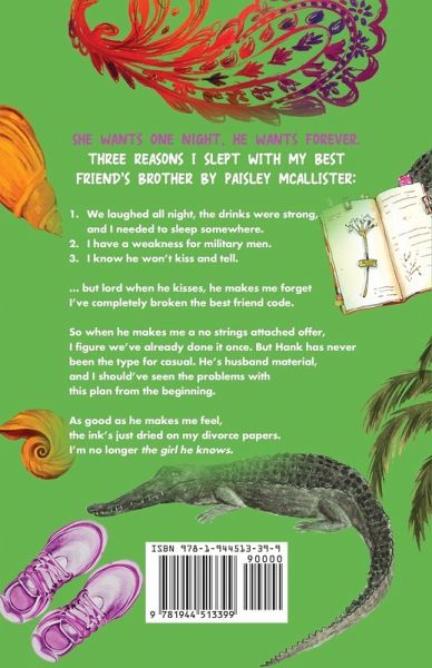 Three reasons I slept with my best friend's brother by Paisley McAllister:1. We laughed all night, the drinks were strong, and I needed to sleep somewhere.2. I have a weakness for military men.3. I know he won't kiss and tell. ... but lord when he kisses, he makes me forget I've completely broken the best friend code. So when he makes me a no strings attached offer, I figure we've already done it once. But Hank has never been the type for casual. He's husband material, and I should've seen the problems with this plan from the beginning. As good as he makes me feel, the ink's just dried on my divorce papers. I'm no longer the girl he knows.