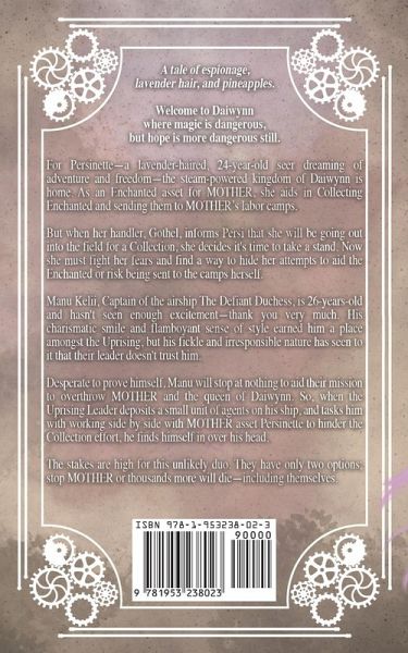 A tale of espionage, lavender hair, and pineapples.Welcome to Daiwynn where magic is dangerous, but hope is more dangerous still. For Persinette-a lavender-haired, 24-year-old seer dreaming of adventure and freedom-the steam-powered kingdom of Daiwynn is home. As an Enchanted asset for MOTHER, she aids in Collecting Enchanted and sending them to MOTHER's labor camps. But when her handler, Gothel, informs Persi that she will be going out into the field for a Collection, she decides it's time to take a stand. Now she must fight her fears and find a way to hide her attempts to aid the Enchanted or risk being sent to the camps herself. Manu Kelii, Captain of the airship The Defiant Duchess, is 26-years-old and hasn't seen enough excitement-thank you very much. His charismatic smile and flamboyant sense of style earned him a place amongst the Uprising, but his fickle and irresponsible nature has seen to it that their leader doesn't trust him. Desperate to prove himself, Manu will stop at nothing to aid their mission to overthrow MOTHER and the queen of Daiwynn. So, when the Uprising Leader deposits a small unit of agents on his ship, and tasks him with working side by side with MOTHER asset Persinette to hinder the Collection effort, he finds himself in over his head. The stakes are high for this unlikely duo. They have only two options; stop MOTHER or thousands more will die-including themselves. The unique characters, witty dialogue, and fantasy-meets-steampunk world make this fresh take on the classic tale of Rapunzel a must read for fans of Marissa Meyer's Lunar Chronicles, and Gail Carriger's Parasol Protectorate series.