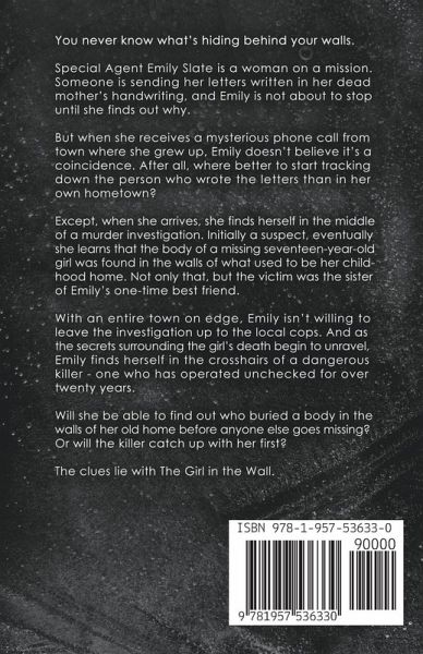 You never know what's hiding behind your walls. Special Agent Emily Slate is a woman on a mission. Someone is sending her letters written in her dead mother's handwriting, and she's not about to stop until she finds out why. But when she receives a mysterious phone call from town where she grew up, Emily doesn't believe it's a coincidence. After all, where better to start tracking down the person who wrote the letters than in her own hometown? Except, when she arrives, she finds herself in the middle of a murder investigation. Initially a suspect, eventually she learns that the body of a missing seventeen-year-old girl was found in the walls of what used to be her childhood home. Not only that, but the victim was the sister of Emily's one-time best friend. With an entire town on edge, Emily isn't willing to leave the investigation up to the local cops. And as the secrets surrounding the girl's death begin to unravel, Emily finds herself in the crosshairs of a dangerous killer-one who has operated unchecked for over twenty years. Will she be able to find out who buried a body in the walls of her old home before anyone else goes missing? Or will the killer catch up with her first? It all comes back to The Girl in the Wall.