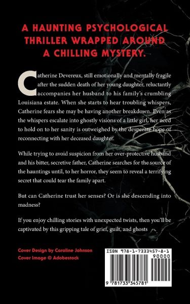 A haunting psychological thriller wrapped around a chilling mystery. Catherine Devereux, still emotionally and mentally fragile after the sudden death of her young daughter, reluctantly accompanies her husband to his family's crumbling Louisiana estate. When she starts to hear troubling whispers, Catherine fears she may be having another breakdown. However, as the whispers escalate into ghostly visions of a little girl, her need to hold on to her sanity is outweighed by the desperate hope of reconnecting with her deceased daughter. Catherine attempts to seek out the spirit while trying to avoid suspicion from her over-protective husband and his bitter, secretive father. To her horror, the hauntings soon reveal a terrifying secret that could tear the family apart. But can Catherine trust her senses? Or is she descending into madness? If you enjoy chilling stories with unexpected twists, then you'll be captivated by this gripping tale of grief, guilt, and ghosts.