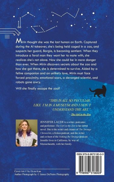 Mirin thought she was the last human on Earth. Captured during the AI takeover, she's being held caged in a zoo, and suspects her guard, Borgie, is becoming sentient. When they introduce a feral man they want her to mate with, she realizes she's not alone. Now she could be in more danger than ever. When Mirin discovers secrets about the zoo and how she got there, she is determined to survive. Aided by a feline companion and an unlikely love, Mirin must face forced proximity, emotional scars, a deranged scientist, and robots gone awry. Will she finally escape the zoo?