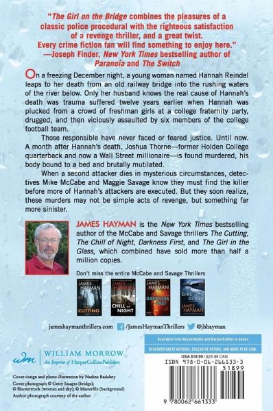 On a freezing December night, a young woman named Hannah Reindel leaps to her death from an old railway bridge into the rushing waters of the river below. Only her husband knows the real cause of Hannah’s death was trauma suffered twelve years earlier when Hannah was plucked from a crowd of freshman girls at a college fraternity party, drugged, and then viciously assaulted by six members of the college football team. Those responsible have never faced or feared justice. Until now. A month after Hannah’s death, Joshua Thorne—former Holden College quarterback and now a Wall Street millionaire—is found murdered, his body bound to a bed and brutally mutilated. When a second attacker dies in mysterious circumstances, detectives Mike McCabe and Maggie Savage know they must find the killer before more of Hannah’s attackers are executed. But they soon realize, these murders may not be simple acts of revenge, but something far more sinister.