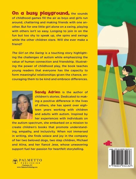 Alone on a swing, a little girl watches as other children play games around her. Longing to make friends but not knowing how, she swings with her arms stretched wide while the other children stop and stare. She loves the feeling of freedom that comes with swinging and spinning, but the other children don't understand. When a little boy asks her to play, she gains the confidence to join in, and before long, she is teaching them all a valuable lesson on acceptance and the true meaning of friendship. Underscoring the value of human connection, The Girl on the Swing centers on the importance of playtime in childhood for fostering relationships and social acceptance. Blending elements of joy, wonder, and vulnerability, author Sandy Adrien draws from her own experiences working with autistic individuals to highlight life's small victories and encourage empathy and inclusivity among young readers. Targeting children ages four to eight, the book promotes better understanding and will resonate with children who have a personal connection to autism, be it a family member, friend, or classmate. And for those who are not yet familiar with autism and spectrum disorders, the book serves a unique resource for helping children to appreciate the challenges faced by individuals with autism while also teaching them to embrace differences and be kind to others. Stay tuned for more captivating adventures on how to make a difference in the lives of others!