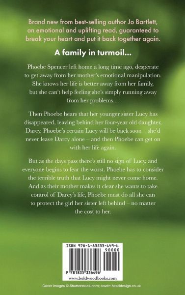 A family in turmoil... Phoebe Spencer left home a long time ago, desperate to get away from her mother's emotional manipulation. She knows her life is better away from her family, but she can't help feeling she's simply running away from her problems... Then Phoebe hears that her younger sister Lucy has disappeared, leaving behind her four-year old daughter, Darcy. Phoebe's certain Lucy will be back soon - she'd never leave Darcy alone - and then Phoebe can get on with her life again. But as the days pass there's still no sign of Lucy, and everyone begins to fear the worst. Phoebe has to consider the terrible truth that Lucy might never come home. And as their mother makes it clear she wants to take control of Darcy's life, Phoebe must do all she can to protect the girl her sister left behind - no matter the cost to her. Praise for Jo Bartlett 'Stunning setting, wonderful characters, and oozing with warmth. A triumph from Jo Bartlett.'** Jessica Redland** 'Perfectly written and set in the beating heart of a community, this story is a wonderful slice of Cornish escapism.' Helen J Rolfe 'I was drawn in from the first word, I've laughed and cried, what a really lovely story' Reader Review 'I would highly recommend this book for a bit of fantastic escapism and love conquering all.' Reader Review