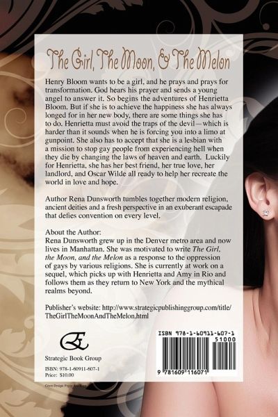 Henry Bloom wants to be a girl, and he prays and prays for transformation. God hears his prayer and sends a young angel to answer it. So begins the adventures of Henrietta Bloom. But if she is to achieve the happiness she has always longed for in her new body, there are some things she has to do. Henrietta must avoid the traps of the devil-which is harder than it sounds when he is forcing you into a limo at gunpoint. She also has to accept that she is a lesbian with a mission to stop gay people from experiencing hell when they die by changing the laws of heaven and earth. Luckily for Henrietta, she has her best friend, her true love, her landlord, and Oscar Wilde all ready to help her recreate the world in love and hope.Author Rena Dunsworth tumbles together modern religion, ancient deities and a fresh perspective in an exuberant escapade that defies convention on every level.About the Author: Rena Dunsworth grew up in the Denver metro area and now lives in Manhattan. She was motivated to write The Girl, the Moon, and the Melon as a response to the oppression of gays by various religions. She is currently at work on a sequel, which picks up with Henrietta and Amy in Rio and follows them as they return to New York and the mythical realms beyond.